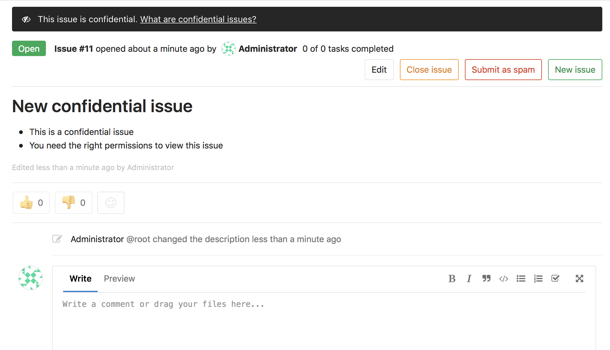 Confidential issues are issues visible only to members of a project with sufficient permissions. Confidential issues can be used by open source projects and companies alike to keep security vulnerabilities private or prevent surprises from leaking out.